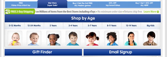 Por ejemplo, veamos la página de www.etoys.com. En la misma página home, vemos como nos muestran enlaces o botones para el usuario que desea buscar juguetes por edad. Además, los botones son de lo más usables.