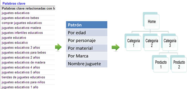 Siguiendo con nuestro ejemplo de la tienda online de juguetes, analizando los patrones de búsqueda identificamos claramente las siguientes tipologías de búsqueda: