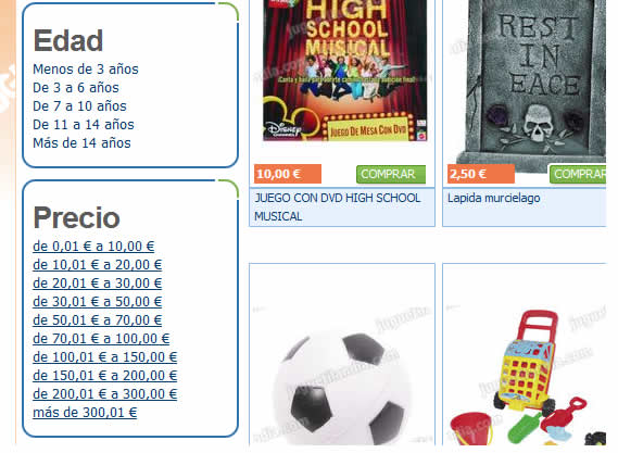 Otro ejemplo que me encanta de usabilidad y SEO para ecommerce es la página home de la tienda online de juguetes Juguetilandia donde ponen una pastilla con enlaces a búsqueda de juguetes por precios. Mucha gente no lo sabe pero hay muchos usuarios en los buscadores que escriben frases como «juguetes de menos de 30 euros» o algo parecido. Además la búsqueda por límite de precio suele ser una de las más utilizadas por el usuario dentro de una tienda online.
