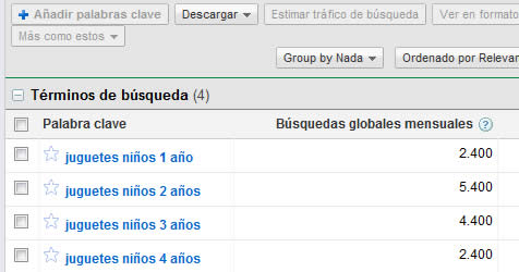 Si queremos que nuestra tienda online de juguetes se posicione lo mejor posible, debemos de crear las agrupaciones de productos según los patrones de búsqueda más utilizados por nuestro público objetivo. Para averiguar esta información nos basamos en las diferentes herramientas sugeridoras de palabras clave como por ejemplo Google Adwords Keyword Tool