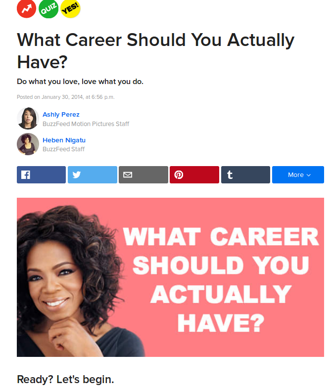 El título del post es “¿Cuál debería ser tu profesión?”. Es una encuesta, es decir, un tipo de contenido interactivo que involucra al lector y le ofrece respuestas personalizadas. Fue publicado en el año 2014 y es uno de los posts más vistos del sitio con 18.500.000 visualizaciones.