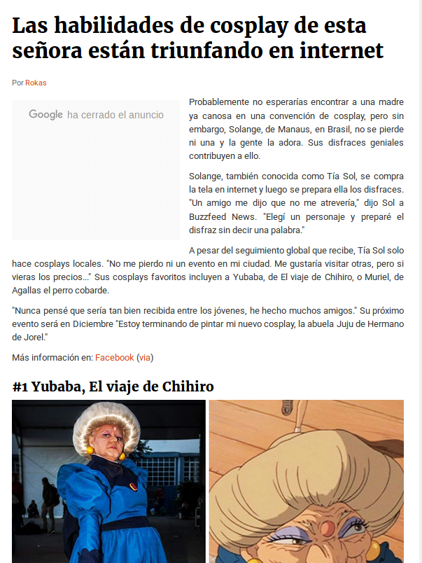 Como puedes ver, el contenido textual es muy poco y está escrito de manera simple y con muchas citas de la protagonista de estos cosplays o encuentros de disfraces de personajes o ideas. Lo que sigue después del texto solo son fotos.