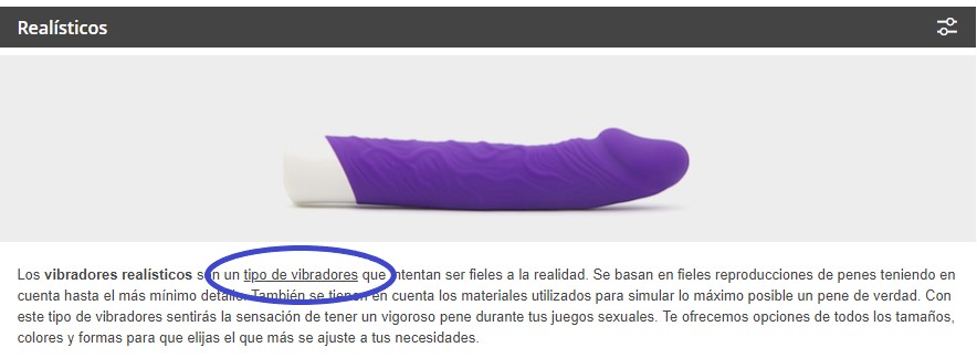 En la imagen podemos ver como en el texto de la categoría vibradores habla de «tipos de vibradores«, desglosándolo en los diferentes tipos, y añadiéndole un enlace que nos redirige a cada una de las subcategorías correspondientes.