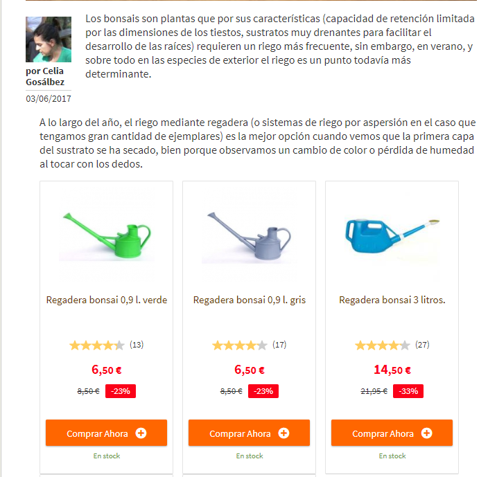 Miren este ejemplo de la tienda online Planeta Huerto como insertan 3 minifichas de producto dentro del contenido de un artículo del blog.